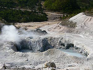 湯布院ICから約20分、由布岳の北東にある伽藍岳(がらんだけ・標高約1045m)の西側の山腹にある日本第二位の強酸性の温泉。ちなみに秋田の玉川温泉が日本一の強酸性の温泉。