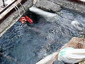 朝9時頃に訪問したので待ち時間なしで入浴。今回はいつもより白濁していて焦げた硫黄臭の臭いがした。余談だが橋の上から湯筒を見ると、湯筒の階段の脇で家族(6・7人)が地べたに座って何かを食べていた。何を食べているのかな?とよく見ると、なんと豚しゃぶをしていた。湯筒から雪平鍋に温泉を入れしゃぶしゃぶした後汚れたお湯を川に捨て又湯筒からお湯をくみなおしていた。お鍋をダイレクトで湯筒に入れて豚の脂で汚れないのか?その他に色々と???う~ん、「豚しゃぶ家族」強者だ!【2010年12月5日/日帰り】